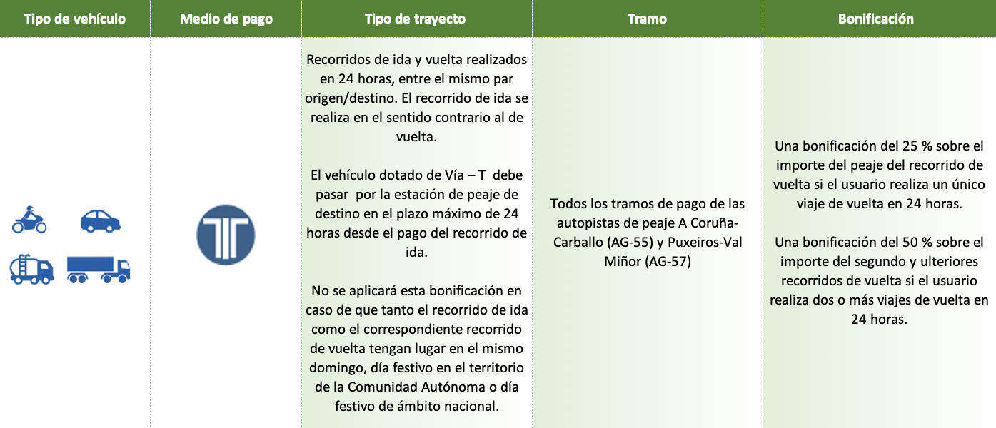 - Que los recorridos de ida y vuelta sean realizados por el mismo vehículo ligero comunicado a la sociedad concesionaria a través del formulario de alta y que el pago de los mismos se hubiesen realizado también empleando el dispositivo Vía-T comunicado a Autoestradas de Galicia a través del mismo formulario de alta.
