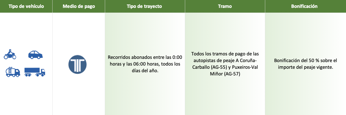 Bonificación del 50 % sobre el importe del peaje vigente.